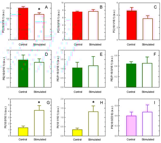 Changes in POA-containing species in human monocytes. The levels of major POA-containing PC (A–C), PE (D–F), PI (G,H), and PS (I) molecular species in resting (Control) and stimulated monocytes were determined by LC-MS. The data are shown as mean values ± standard error (n = 3). * p < 0.05, significantly different from the corresponding species in control cells. a.u., arbitrary units.