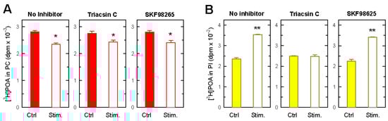 Effect of triacsin C and SKF98625 on the movement of POA between phospholipids in zymosan-stimulated monocytes. The [3H]POA-prelabeled cells were either unstimulated (Ctrl, colored bars) or stimulated by 1 mg/mL zymosan for 3 h (Stim, open bars) in the absence (No inhibitor) or presence of 3 µM triacsin C or 10 µM SKF98625, as indicated. Afterward, 3H-radioactivity levels in PC (A) and PI (B) were measured. The data are shown as mean values ± standard error (n = 3). * p < 0.05, ** p < 0.01, significantly different from control (Ctrl).