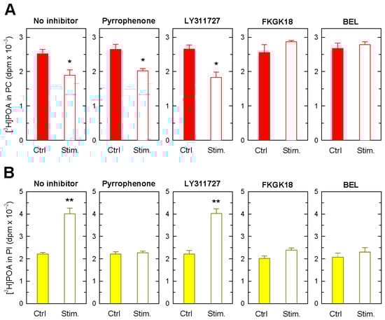 Effect of phospholipase A2 inhibitors on the movement of POA between phospholipids in zymosan-stimulated monocytes. The [3H]POA-prelabeled cells were either unstimulated (Ctrl, colored bars) or stimulated by 1 mg/mL zymosan for 3 h (Stim, open bars) in the absence (No inhibitor) or presence of the following inhibitors: 1 µM pyrrophenone, 25 µM LY311727, 10 µM FKGK18, or 10 µM BEL, as indicated. Afterward, 3H-radioactivity levels in PC (A) and PI (B) were measured. The data are shown as mean values ± standard error (n = 3). * p < 0.05, ** p < 0.01, significantly different from control (Ctrl).