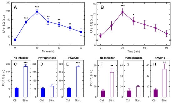 LysoPI production by zymosan-stimulated human monocytes. Time-course of the zymosan-stimulated formation of LPI(18:0) (A) and LPI(18:1) (B), as measured by LC-MS. These data are shown as mean values ± standard error (n = 3). * p < 0.05, ** p < 0.01, *** p < 0.001 represent significant difference from unstimulated cells at time zero. To assess the effect of phospholipase A2 inhibitors on lysoPI formation, the cells were pretreated for 15 min with 1 µM pyrrophenone (D,G), 1 µM FKGK18 (E,H) or neither (labeled as ‘No inhibitor’) (C,F), as indicated. Afterward, the cells were stimulated with zymosan, and LPI(18:0) (C–E) or LPI(18:1) (F–H) were measured by LC-MS. These data are shown as mean values ± standard error (n = 3). ** p < 0.01, *** p < 0.001, significantly different from control (Ctrl).