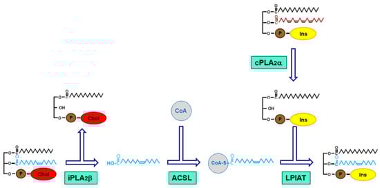 According to this pathway (Figure 8), POA is mobilized primarily from 1-palmitoyl-2-palmitoleoyl-glycero-3-phosphocholine (PC(16:0/16:1)) by iPLA2β. In parallel, cPLA2α hydrolyzes the arachidonate-containing PI species 1-stearoyl-2-arachidonoyl-glycero-3-phosphoinositol (PI(18:0/20:4)) and 1-oleoyl-2-arachidonoyl-glycero-3-phosphoinositol (PI(18:1/20:4)) to produce the corresponding lysophospholipids, LPI(18:0) and LPI(18:1). Acyl-CoA synthetases (ACSL) generate palmitoleoyl-CoA, which will be used by CoA-dependent acyltransferases (LPIAT) to form PI(18:0/16:1) and PI(18:1/16:1).