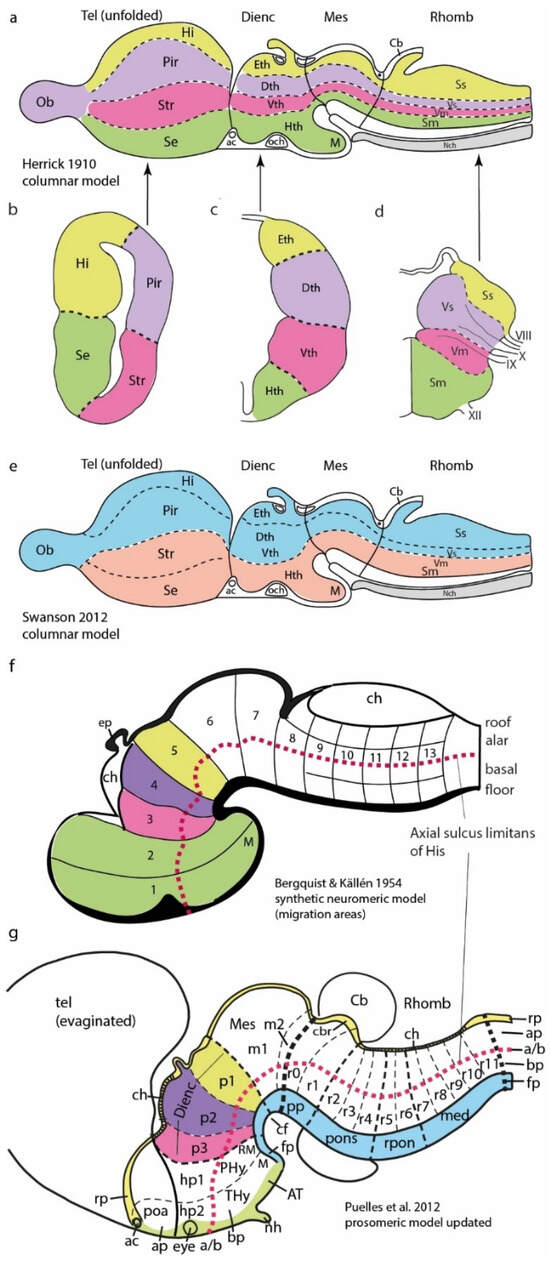 Models mentioned in the text. (a) Columnar model of Herrick [1], postulating an unbent length axis ending in the telencephalon. Note that the notochord lies only under the brainstem (Mes, Rhomb), but the postulated longitudinal columns also extend into the forebrain (Dienc, Tel). The rostral ends of the floor and roof domains are not indicated. (b–d) Cross-sections through Tel, Dienc, and Rhomb in (a), illustrating the postulated four columns at each level. (e) A modification of Herrick’s columnar model proposed by Swanson [2,3]. Essentially, a general division into basal (cream/pink) and alar (blue) plates is proposed, again without a topographic correlation with the notochord. The roof and floor are not mapped precisely, but the postulated floor possibly reaches the anterior commissure (ac), implying a prechordal part. (f) The neuromeric model of Bergquist and Källén [5], also encompassing His’s [6,7] longitudinal zones (names at caudal end) and the alar–basal boundary (red dashes). Note that Tel forms a unit with the hypothalamus, the secondary prosencephalon (green). The diencephalon lies caudal to that and consists of three transverse neuromeres, thought to more faithfully represent the domains with identical color codes in (a,c). All neuromeres extend from the roof to the floor, whose rostral ends are not represented. The intersection of longitudinal and transversal limits creates a number of quadrangular ‘migration areas’. M indicates the mamillary body. (g) The neuromeric (prosomeric) model of Puelles et al. ([8]; significantly updated relative to earlier versions). There are three parallel axial references: (1) the floor (blue) ending rostrally at the mamillary body, (2) the alar–basal boundary (red dashed line; determined molecularly in the forebrain by Shh and Nkx2.2 markers), and (3) the roof plate (yellow), fate-mapped in several vertebrate species to end at the anterior commissure (ac). The concept of a unitary secondary prosencephalon from f is maintained, subdivided into two hypothalamo-telencephalic prosomeres (hp1, hp2), whose floor is retromamillary (RM) or mamillary (M). The respective parts of the hypothalamus are named ‘peduncular hypothalamus’ (PHy) and ‘terminal hypothalamus’ (THy). Hp2 ends rostrally at the acroterminal rostromedian domain (green), stretched between the rostral roof and rostral floor, which displays unique formations such as the alar preoptic lamina terminalis and the optic chiasma, and the basal infundibular tuberal region with the neurohypophysis. The diencephalon is trineuromeric, as in (f). The midbrain has two unequal neuromeres (m1, m2) and ends at the isthmo-mesencephalic boundary (thick black dashes). The hindbrain shows 12 rhombomeres, some of which are cryptic (detected only molecularly and experimentally). The hindbrain has four proneuromeres (prepontine: pp; pontine: pons; retropontine: rpon; and medulla: med; limits shown by intermediate dashes). The spinal cord (beyond the rhombospinal boundary; thick black dashes) has myelomeres.