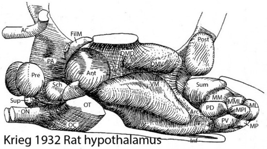- Krieg, W.J.S. The hypothalamus of the albino rat. J. Comp. Neurol. 1932, 5, 19–89. [Google Scholar] [CrossRef]
