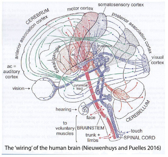 During the last century, there has also been a substantial increase in our knowledge of brain connections and functions. Unfortunately, brain connections are likewise largely unexplained. They are, so far, generally unpredictable, except for perhaps those of motoneurons. Helped by experimental hodological studies, lesion studies, and clinical cases, we have learned to schematize some of the basic functional wiring of the brain, a much-valued resource in clinical work (e.g., Figure 3). However, the apparent function of a brain pathway does not tell us how it came to exist ontogenetically or evolutionarily and may obscure less salient parallel functions (see [14]). Conventional hodological schemata refer only to a few cell types, fewer than those really present. Presently, we cannot visualize 5300 brain cell types in our functional diagrams, so much analysis remains to be completed in this context (we need more detailed region-specific diagrams). In the meantime, this leaves us, we posit, with knowledge without complete understanding, not a desirable position in science.