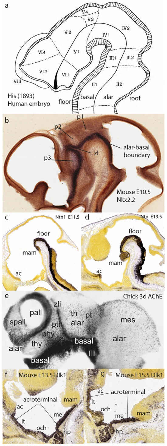 The model of His [6,7] and its DV elements from a modern perspective. (a) The schema of His [6,7] with his precise DV subdivision into floor, basal, alar, and roof longitudinal zones (including the limiting and appropriately bent alar–basal boundary sulcus ending at the optic stalk). His also entered relatively imprecise AP partitions (Roman/Arabic tags), now substituted by neuromeres. He was the first to postulate the isthmic domain (tagged III1/III2) as a separate brain segment (see Figure 5c). (b) An E10.5 mouse brain showing the alar–basal band of Nkx2.2 expression (downstream of notochordal SHH signal), which approximates the sulcus of His in (a). The neuromeric alar ventricular concavities of the three diencephalic segments are visible (p1, p2, p3). The zona limitans interthalamica (zl) is a transverse singularity of the p2/p3 boundary, caused by a separate Shh enhancer, secondarily affecting Nkx2.2. (c,d) Floor plate labeling at E11.5 and E13.5 with Ntn1 (from [8]; Allen Institute data). The floor stops rostrally over the tip of the notochord at the mamillary pouch (mam). Note also a slight Ntn1 signal at E13.5 at the locus of the anterior commissure (fate-mapped rostralmost roof plate). (e) Three-day-old chick embryo brain reacted wholemount for AChE. This marker identifies postmitotic neurons and is generally negative in progenitor cells (labeling at the zl, the p2/p3 interneuromeric limit, contrarily marks radial glia or progenitors). The neurogenetically precocious basal zone is full of neurons, while the retarded alar zone is relatively unpopulated at this stage. Note some transverse neuromeric borders orthogonal to the alar–basal limit. The telencephalon shows a fully alar pattern, contradicting columnar assumptions ([19]). (f,g) The selective expression of Dlk1 at the mouse acroterminal domain at E13.5 and E15.5 (data from the Allen Developmental Mouse Brain Atlas).