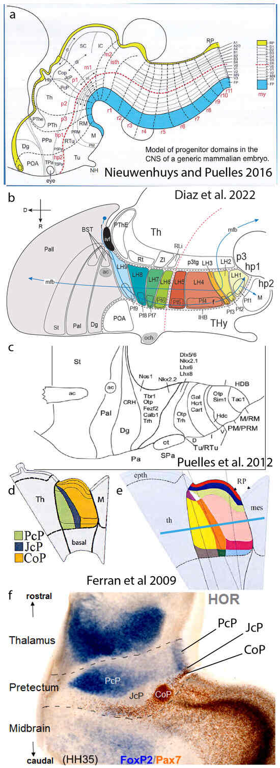 The secondary (advanced) DV and AP microzonal regionalization of neuromeres. (a) A prosomeric map of advanced DV patterning reported at different places of the neural tube, collected from the literature and personal results by Nieuwenhuys and Puelles [15]. The mapping was already incomplete at the forebrain levels at that time due to the hypothalamic data of [8] and unrepresented pretectal data from Ferran et al. [44,45]. However, it allows us to appreciate the commonality of the pattern observed in the spinal cord and hindbrain. (b,c) These panels show partial molecular mapping data in the hypothalamus that suggest a systematic alar and basal DV subdivision into roughly parallel (longitudinal) molecularly diverse microzonal compartments, both at the lateral hypothalamus ((b); Diaz et al. [41]) and in the general bineuromeric distribution of peptidergic neurons of several subtypes ((c); Puelles et al. [8]). Several single-cell transcriptomic studies corroborate multiple cell types of various sorts in these areas. Our studies correlated this distribution with our molecular characterization of the early progenitor domains. Note that the optic chiasma roughly marks the alar–basal boundary. (d–f) An illustration of an advanced (secondary) AP microzonal tripartite pattern in the pretectal alar plate (p1 prosomere: precommissural PcP, juxtacommissural JcP, and commissural CoP AP compartments; Ferran et al. [44,45]). The image in (d) shows an early stage previous to DV microzonation, while (e) displays the added DV subdivision. The image in (f) presents a horizontal section from a 9d chick embryo (plane indicated in e by a blue bar), where the pretectum (alar p1; boundaries as dashed black lines) is seen lying intercalated between the thalamus (in alar p2) and the midbrain tectum (in alar m1). The Foxp2 signal selectively characterizes intermediate and superficial strata of the rostral PcP subdomain, while PAX7 immunoreaction likewise marks diverse stratified CoP derivatives; the intermediate JcP subdomain is negative for these two markers but stains specifically, e.g., for Six3. This result simultaneously shows the radially complete AP partition and reveals that each microzone forms different neuronal subtypes that occupy different layers of the microzonal mantle. Each of these derivatives is fated to produce different nuclei or cell layers with differential connective properties. The m1 midbrain tectum in this image also shows a more thinly layered rostral microzonal component found next to the CoP and a more thickly layered caudal component (the optic tectum). The signal-free boundary area between the thalamus and PcP may represent the missing third thalamic subdivision (consistent with all neuromeres having this pattern).