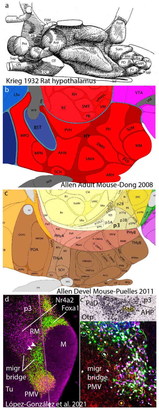 A recapitulation of our argument using the hypothalamus as an example. (a,b) These panels show two examples of columnar order-less descriptions of nuclei in the hypothalamus, by Krieg [11] in (a) and Dong [4] in (b), representing examples of what we have called ‘potato-sack morphology’, that is, a description without any sort of classificatory or explanatory concepts. (c) Here, LP, working in collaboration with the Allen Institute on the Ontology and Reference Atlases of the Developing Mouse Brain Atlas (2008–2011), proposed the AP partition of the P56 hypothalamus into two hypothalamic neuromeres, defining their respective floor, basal, alar, and roof domains plus DV microzonal divisions. The known adult nuclei fell naturally into the resulting intersectional pigeonholes and were consistent with the gene patterns analyzed. This effort, using some 4000 genes at the Allen Institute, helped to evolve the more complete, updated prosomeric model of Puelles et al. [8]. (d,e) Jumping now to phenomena in a single microzone from López-González et al. [50], we show a sagittal image of the retromamillary area (RM; a basal plate area of hp1 next to the floor, understood within columnar theory as the ‘supramamillary area’), where we see distinct ventral and dorsal subareas differentially labeled for Foxa1 (green) and Nr4a2 (fuchsia). Both populations generate cells that enter a rostralward migration stream that courses above the mamillary body into hp2 and enters the suprajacent ventral tuberal area. As the cells rostrally approach the acroterminal area (which may have attracted them), they stop migrating, forming an oval-shaped nucleus, the classically known ventral premamillary nucleus. There is very little cell mixing with cells derived from hp2, whose cells often express quite different gene markers. In contrast, the PMV migration is composed of intermixed green- and fuchsia-labeled RM cells, which subdivide into several intermixed subgroups according to which of the two markers they express. The final PMV nucleus has a molecularly distinguishable core-and-shell structure with multiple cell types.