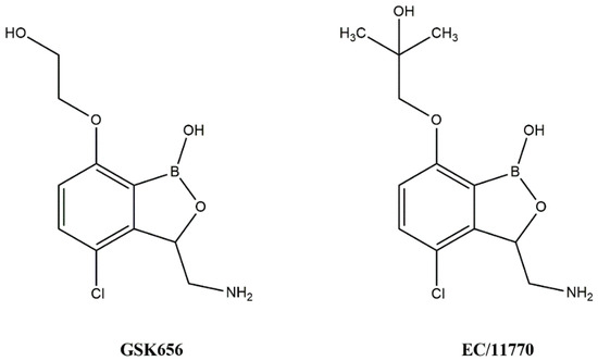 - Li, X.; Hernandez, V.; Rock, F.L.; Choi, W.; Mak, Y.S.L.; Mohan, M.; Mao, W.; Zhou, Y.; Easom, E.E.; Plattner, J.J.; et al. Discovery of a Potent and Specific M. Tuberculosis Leucyl-TRNA Synthetase Inhibitor: (S)-3-(Aminomethyl)-4-Chloro-7-(2-Hydroxyethoxy)Benzo[c][1,2]Oxaborol-1(3H)-Ol (GSK656). J. Med. Chem. 2017, 60, 8011–8026. [Google Scholar] [CrossRef] [PubMed]