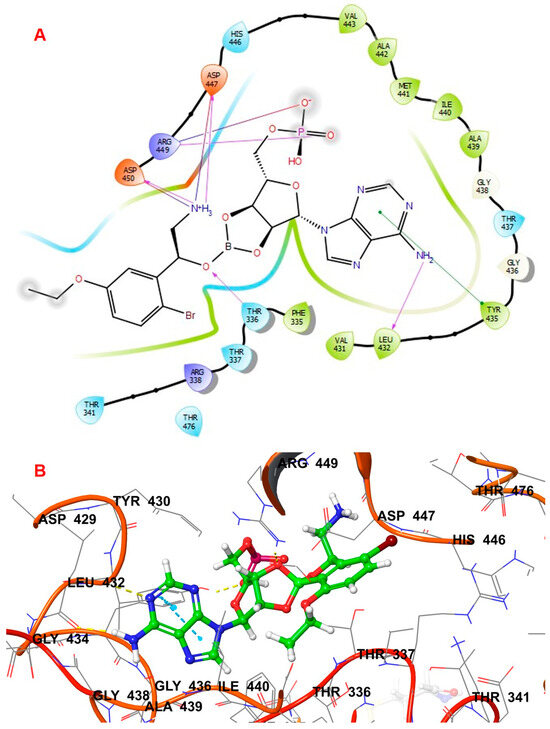 Compound 1035 obtained an XP docking score of −8.819 Kcal/mol and an MMGBSA value of −87.56 Kcal/mol. The purine nucleus was buried inside the binding site, which was stabilized by the pi–pi interaction with the hydrophobic Tyr435 residue. A hydrogen bond was found between the fourth position carbonyl group attached to purine and Leu432 residue. Met441 and Asp450 residues were involved in hydrogen bonds with the amino group attached to the methyl butanoate chain. The ligand was further stabilized inside the binding cavity through hydrogen bonds involving Thr336 with the carbonyl group and Arg449 with the hydroxyl group. The docking interactions of the compound 1035 are depicted in Figure 4.