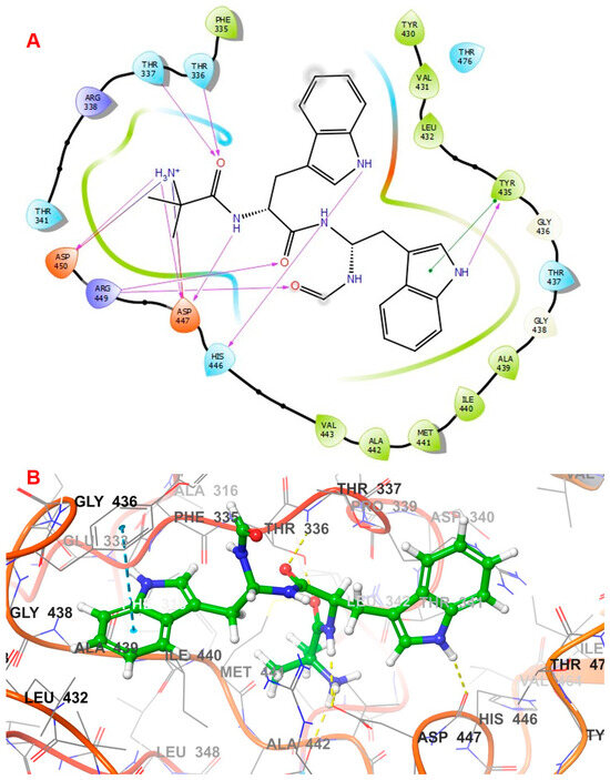 Compound 1054 obtained an XP docking score of −9.006 Kcal/mol and an MMGBSA value of −79.79 Kcal/mol. The indole nucleus attached to the formyl amino branch was tightly fitted inside the binding cavity, stabilized by the pi–pi interaction with the hydrophobic residue Tyr435. The heterocyclic nitrogen atom of the indole moiety also formed a hydrogen bond with Tyr435. Various carbonyl groups were involved in hydrogen bonding with residues Thr336, Thr337, and Arg449. The nitrogen of the indole moiety present at the opposite end formed a hydrogen bond with His446 residue. The terminal amino group was stabilized by hydrogen bonding with Asp447 and Asp450. The amino group attached to the methyl propanamide chain formed a hydrogen bond with residue Asp447. The docking interactions of the compound 1054 are depicted in Figure 5.