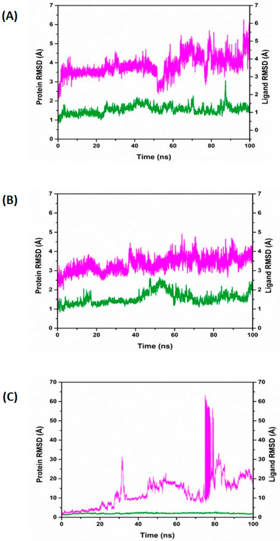 Root mean square deviation (RMSD) of the protein and ligand. Green color represents the target protein, whereas the magenta color represents the compounds, respectively: (A) 5AGS_1035 complex; (B) 5AGS_1054 complex; (C) 5AGS_2077 complex.