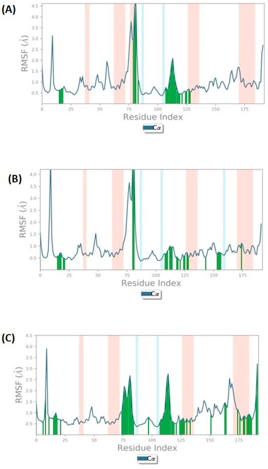 Protein root mean square fluctuation (P-RMSF) of docked complexes. (A) 5AGS_1035 complex; (B) 5AGS_1054 complex; (C) 5AGS_2077 complex. The blue line shows RMSF, the green line represents the interactions formed during simulation, the pink columns indicate alpha helices, and the blue columns indicate beta-strands.