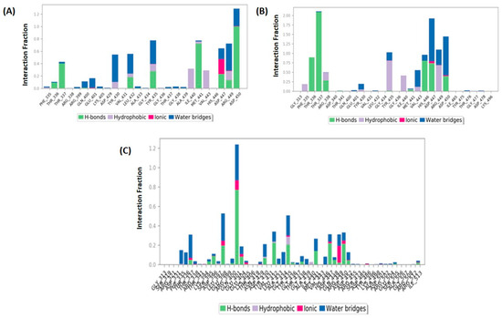 Protein–ligand contact mapping. (A) 5AGS_1035 complex; (B) 5AGS_1054 complex; (C) 5AGS_2077 complex.