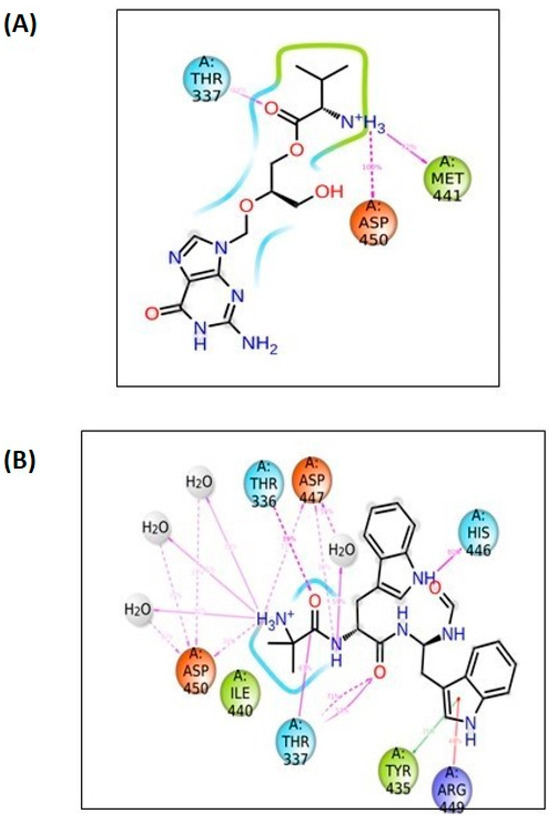 A protein–ligand mapping plot of the 5AGS_1035 complex (Figure 10A) revealed thatThr337, Leu432, Tyr435, Met441, Asp447, and Asp450 exhibited hydrogen bonding throughout the 100 ns simulation, while some of the residues also showed hydrophobic interactions (Ile440, Val443, Arg449), an ionic interaction in Asp447, and water bridges in some residues. However, the major residues in the ligand–protein contact reveal 39% and 72% contact over the span of the simulation in the Thr337 and Met441 residues, respectively, whereas the Asp450 residue exhibits more than 100% of the hydrogen bond interaction over the span of the entire simulation. The 2D interaction diagram (Figure 11A) revealed that the amino group (attached to the methyl butanoate chain) was involved in hydrogen bonding with Met441 and Asp450 residues. Another hydrogen bond was observed between the carbonyl group (of methyl butanoate chain) and Thr337 residue.