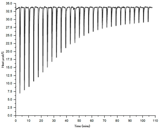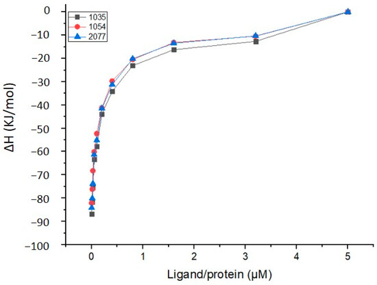 The top three hit molecules were tested for their binding affinity toward the LeuRS protein. Figure 12 demonstrates the course of reaction between the ligands and LeuRS protein until it reaches saturation. After about 105 min, active sites of the protein became completely saturated or occupied with the ligands, as observed by the absence of change in the peaks. As all three ligands have similar binding patterns, they also exhibited quite similar affinity. The results were fitted in the model, and binding parameters, i.e., the affinity between LeuRS and ligands (compounds 1035, 1054, and 2077), were measured via the floating association constant (ka), binding enthalpy (ΔH), and the number of binding sites (n).