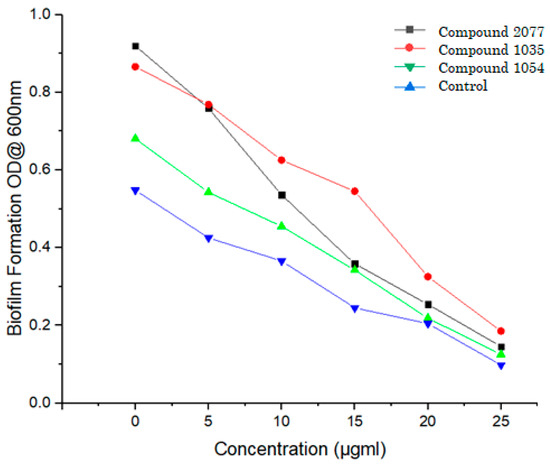 Biofilm formation inhibitory activity by compounds 1035, 1054, and 2077 at different concentrations with control (benzoxaborole AN2690).