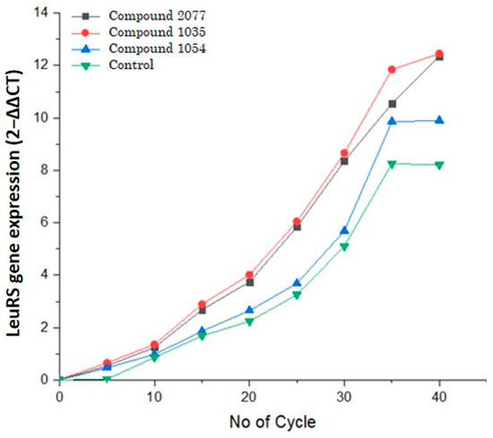 Leucyl t-RNA synthetase is the key enzyme responsible for growth, development, and virulence [32]. Therefore, inhibiting this enzyme restricts the survival of the mycobacterial population and the management of tuberculosis. Mycobacterium tuberculosis possesses the LeuRS gene in its genome and mitochondria that encode the enzyme. Several studies have demonstrated that cytosolic LeuRS is more functional and effective in the growth and development of Mycobacterium tuberculosis [8]. The test compounds, along with the positive control AN2690, were evaluated for translation inhibitory role via inhibiting the LeuRS gene, where mRNA folds per cycle were determined. Certainly, benzoxaborole AN2690 showed lower copies of LeuRS in the RTPCR cycle, whereas compound 1054 was more effective in down-regulating the LeuRS gene as compared to the compounds 1035 and 2077 (Figure 15).