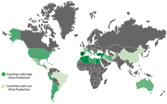 The Mediterranean climate, characterized by warm, arid summers and cool, wet winters, is one that olive trees can withstand. The olive tree is a thermophilic species, well-suited to endure both drought and salinity challenges [26]. It thrives in a variety of soil types, though it exhibits a preference for sandy loam soils that have a moderate depth [3]. Olives are cultivated in the following regions across the globe (Figure 1): in Asia, you can find olive cultivation (in countries such as China, India, Iran, Syria, Pakistan, Jordan, Palestine, Israel, Iraq, Lebanon, and Turkey); in Oceania, olive trees are grown (in New Zealand and Australia); in the Americas, olives thrive (in the United States, Mexico, Uruguay, Chile, Peru, and Argentina); in Europe, olive cultivation is prominent (in Greece, Italy, Spain, Cyprus, Montenegro, France, Portugal, Croatia, and Albania); Lastly, in Africa, you will find olive trees flourishing (in Morocco, South Africa, Tunisia, Egypt, Libya and Algeria) [27,28].