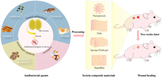 Antibacterial agent-loaded silk sericin composite biomaterials for wound healing. The silk sericin layer isolated from silkworm cocoons has certain intrinsic antimicrobial properties [39,49]. Antimicrobial agents added to SS composites fall into three main categories, inorganic antimicrobials, natural antimicrobials, and antibiotics. SS-based antimicrobial composites can be processed and prepared into different material types including nanoparticles, films, sponges, hydrogels and nanofibers [30,32,33,62,63]. The SS composites accelerated wound healing in mice compared to controls [30,64,65].