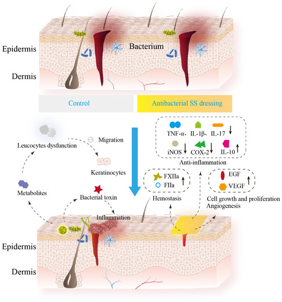 Mechanism of skin wound healing promoted by SS-based antimicrobial composites. The skin contains the epidermis and the dermis [140]. In the control group, toxins produced by bacteria elevate pro-inflammatory cytokines (IL-1β, TNF-α) and increase the inflammatory response in wounds [11]. Bacterial metabolites can also cause leukocyte dysfunction [9], which inhibits migration of epidermal cells and keratinocytes [10]. For the treated group with SS-based antimicrobial dressing, pathogenic bacteria proliferation was significantly inhibited and it can promote wound healing through hemostasis, anti-inflammation, cell proliferation and angiogenesis [34,66,67,80,141,142,143]. In particular, SS-based antimicrobial materials are favorable for hemostasis through increasing the activity of FXIIa (the initiator of the coagulation cascade) and FIIa (the final thrombin in the coagulation cascade) [66]. The dressings also has anti-inflammatory properties through down-regulating pro-inflammatory cytokines such as TNF-α, IL-1β, and IL-17 [144] as well as synthase enzymes involved in the inflammatory process, including COX-2 (cyclooxygenase) and iNOS (inducible nitric oxide synthase) [142] and increasing the anti-inflammatory cytokine IL-10 [141]. Inhibition of pathogenic bacteria will increase growth factor secretion and further promote cell proliferation, migration and angiogenesis [34,143].