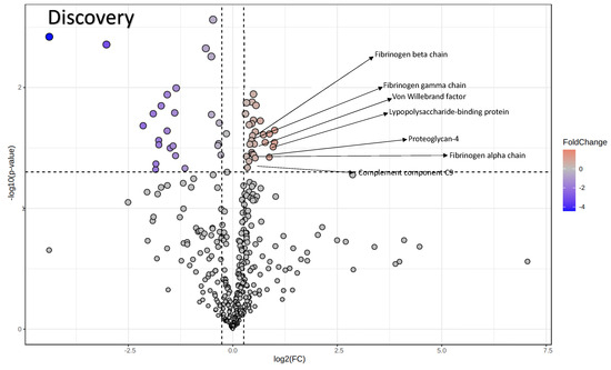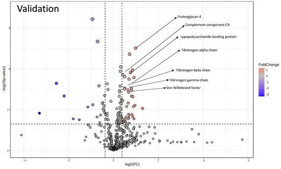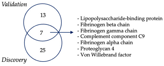 Seven proteins were modulated in both the discovery and the validation cohorts (Figure 4), including fibrinogen α (FIBA), fibrinogen β (FIBB), fibrinogen γ (FIBG), von Willebrand factor (VWF), complement component 9 (C09), proteoglycan 4 (PRG-4), and lipopolysaccharide-binding protein (LBP).