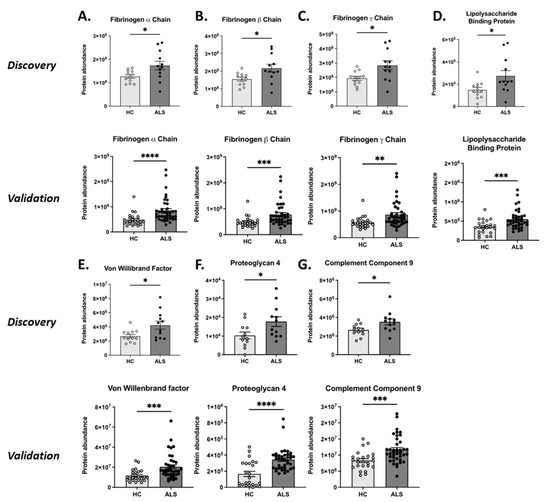 Each graph illustrates the seven proteins identified in both the discovery and validation phases. (A) Fibrinogen α (FIBA); (B) fibrinogen β (FIBB); (C) fibrinogen γ (FIBG); (D) von Willebrand Factor (VWF); (E) complement component 9 (C09), (F) lipopolysaccharide-binding protein (LBP), and (G) proteoglycan 4 (PRG-4). For statistical analysis Mann–Whitney test was used: * p < 0.05, ** p < 0.01, ***p < 0.001, and **** p < 0.0001.