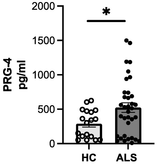 In ALS, both BBB and the blood–spinal cord barrier (BSCB) become hyperpermeable, enabling a passage for a broader array of molecules, thereby contributing to a more severe and rapidly progressing disease course [61]. The breakdown of the BBB has also emerged as a potential early indicator of human cognitive dysfunction in Alzheimer’s disease [62] and vascular mild cognitive impairment [63], leading us to hypothesize on the correlation observed by us between elevated levels of PRG-4 and cognitive impairment of ALS patients.