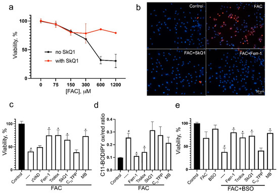 Ferric ammonium citrate induces ferroptosis in H9c2 cardiomyocytes. (a) Cells were incubated with FAC for 48 h. Cell viability was measured using the CellTiterBlue reagent. A total of 50 nM SkQ1 (red points) was added simultaneously with FAC. (b) Cells were incubated with 0.6 mM FAC alone and in combination with 50 nM SkQ1 or 0.1 mM Ferr-1 for 48 h, stained with 50 μg/mL propidium iodide (red) and 8 μM Hoechst 33,258 (blue) for 30 min, and analyzed using Olympus IX83. Bar 50 μm. (c) Cells were incubated with 0.6 mM FAC alone and in combination with 10 μM zVADfmk (zVAD), 0.1 mM Ferr-1, 50 nM SkQ1, 50 nM C12TPP, and 250 nM MB for 48 h. (d) Cells were incubated with 0.6 mM FAC alone and in combination with 50 nM SkQ1, 50 nM C12TPP, 0.1 mM Ferr-1, 0.2 mM Trolox, and 250 nM MB for 24 h. Then, cells were stained with 2 μM C11-BODIPY581/591 for 30 min and analyzed using flow cytometry. Ratio of green/red fluorescence was measured. Mean values are presented. (e) Cells were incubated with 0.6 mM FAC alone and in combination with 1 mM BSO for 48 h. A total of 50 nM SkQ1, 50 nM C12TPP, 0.1 mM Ferr-1, 0.2 mM Trolox, and 250 nM MB were added simultaneously with FAC and BSO. p < 0.05 (#)—the significance of the difference between control and FAC or FAC+BSO sample. p < 0.05 (*)—the significance of the difference between samples treated with FAC or FAC+BSO and other samples.