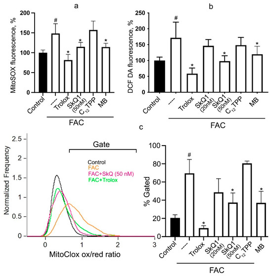 Ferrous ammonium citrate induces oxidative stress, ROS production, and lipid peroxidation in mitochondria. Cells were incubated with 0.6 mM FAC alone and in combination with 20 nM or 50 nM SkQ1, 50 nM C12TPP, 250 nM MB, or 0.2 mM Trolox for 24 h and analyzed using flow cytometry. (a) Cells were stained with 1 µM MitoSOX for 30 min. Mean values of fluorescence are presented. (b) Cells were stained with 1.8 µM CM-H2DCFDA for 30 min. Mean values of fluorescence are presented. (c) Cells were stained with 100 nM MitoCLox for 1 h. Ratio of green/red fluorescence was measured and analyzed using gating procedure. p < 0.05 (#)—the significance of the difference between control and FAC sample. p < 0.05 (*)—the significance of the difference between samples treated with FAC and other samples.
