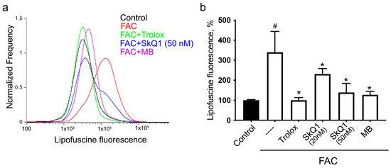 Ferrous ammonium citrate induces accumulation of lipofuscin-like material in H9c2 cells. Cells were incubated with 0.6 mM FAC alone and in combination with 20 nM or 50 nM SkQ1, 50 nM C12TPP, 250 nM MB, or 0.2 mM Trolox for 24 h and analyzed using flow cytometry without staining. Representative histograms (a) and mean values of fluorescence (b) are presented. p < 0.05 (#)—the significance of the difference between control and FAC sample. p < 0.05 (*)—the significance of the difference between samples treated with FAC and other samples.