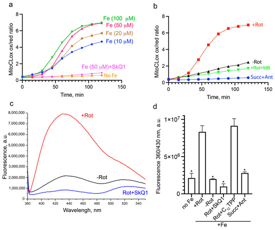 Mitochondrial lipid peroxidation (a,b) and accumulation of lipofuscin-like material (c,d) induced by Fe2+ in isolated rat heart mitochondria. (a,b) Mitochondria were incubated with 50 nM MitoCLox and various concentrations of FeSO4 in the presence of glutamate (5 mM), malate (5 mM), rotenone (rot, 10 μM), or in the presence of succinate (succ, 5 mM) and antimycine A (Ant, 1 μM). A total of 300 nM SkQ1, 300 nM C12TPP, or 1 μM MB were added simultaneously with 50 μM FeSO4. Where indicated, rotenone was omitted or succinate and antimycine A were added. In the probe “no Fe”, 0.1 mM EGTA was added. Fluorescent spectra were analyzed after subtraction of light scattering. Kinetics of MitoCLox oxidation calculated as a ratio of fluorescence at 521 nm and 596 nm are shown. (c,d) Mitochondria were incubated with 50 μM FeSO4 in the presence of glutamate (5 mM), malate (5 mM), rotenone (10 μM), or in the presence of succinate (succ, 5 mM) and antimycine A (1 μM, Ant) for 40 min or 24 h at 37 °C and destructed with 0.5% SDS. A total of 300 nM SkQ1 or 300 nM C12TPP were added simultaneously with FeSO4. In the probe “no Fe”, 0.1 mM EGTA was added in the presence of glutamate (5 mM), malate (5 mM), and rotenone (10 μM). Fluorescent spectra at 360 nm excitation were analyzed. The representative spectra obtained by subtracting the 40 min spectra from the corresponding 24 h spectra (c) and fluorescence at 430 nM from these spectra (d) are shown. p < 0.05 (*)—the significance of the difference between samples treated with Rot+Fe and other samples.