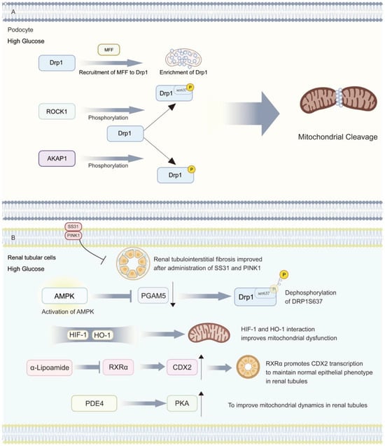 Diabetic kidney disease and mitochondrial dynamics disorder. (A) The damage mechanism of mitochondrial lysis in podocytes under a high-glucose environment. (B) The protective mechanism of reducing mitochondrial lysis in tubular cells under a high-glucose environment.