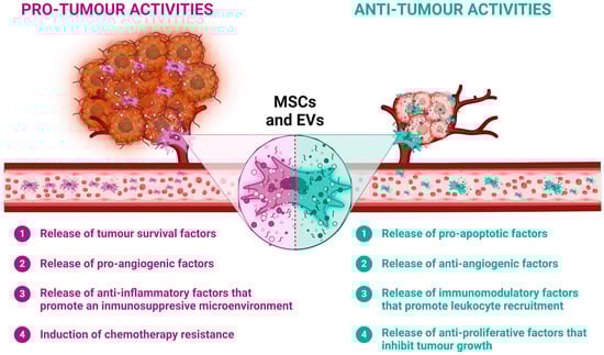 However, the role of MSCs in cancer therapy presents a complex picture. While MSCs can home to tumour sites after their systemic administration, their impact on disease progression can be double-edged. On the one hand, they have been reported to directly fight some types of cancer by suppressing cancer cell proliferation through reducing the expression of positive regulators of the cell cycle [13,14,15,16]. On the other hand, it has also been found that MSCs may contribute to tumour growth by fostering a supporting tumour vascular network which modulates the peritumour immune environment, protecting it from immune attack, and promoting the proliferation and invasiveness of cancer stem cells [17,18,19,20,21] (Figure 1). This paradoxical behaviour of MSCs in tumours highlights the need for cautious and nuanced application in anti-cancer therapeutic approaches [22,23].