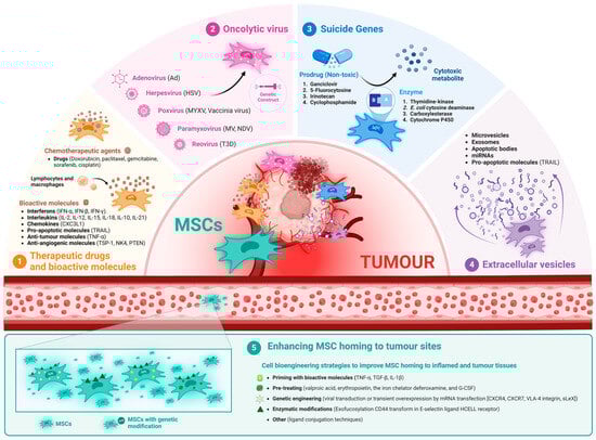 Different strategies to enhance the anti-tumour properties of both MSCs and MSC-derived EVs. (1) MSCs can be used to deliver chemotherapeutic drugs or bioactive molecules (e.g., interferons, interleukins, chemokines, and pro-apoptotic, anti-tumour or anti-angiogenic molecules) directly into the tumour microenvironment. (2) MSCs are effective oncolytic virus carriers because they can be easily infected, allowing viral replication and sustained viability until they reach the tumour microenvironment. (3) MSCs can be genetically engineered to carry suicide genes that encode specific enzymes that convert non-toxic prodrugs into cytotoxic metabolites directly in the tumour cells, increasing the specificity and efficacy of therapy while reducing systemic toxicity. (4) Bioengineered MSC-derived EVs can be customized to improve their therapeutic efficacy and capacity to deliver specific anti-cancer agents. (5) Various bioengineering strategies are being investigated to improve MSC homing to tumours, including priming with bioactive molecules, genetic engineering, enzymatic modification and ligand conjugation techniques. Created using BioRender.