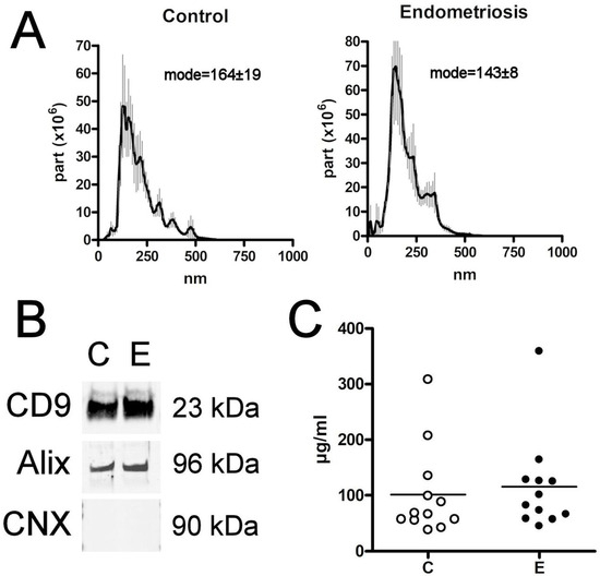(A) Nanovesicle tracking assay confirms that the size of extracellular vesicles obtained corresponds to sEVs. (B) Western blot analysis of sEVs proteins CD9 and Alix from the different groups. Calnexin (CNX) was included as a negative control (the original is included in Supplementary Figure S1). (C) EV levels, expressed as μg prot/mL, detected in the plasma. C = Control; E = Endometriosis.