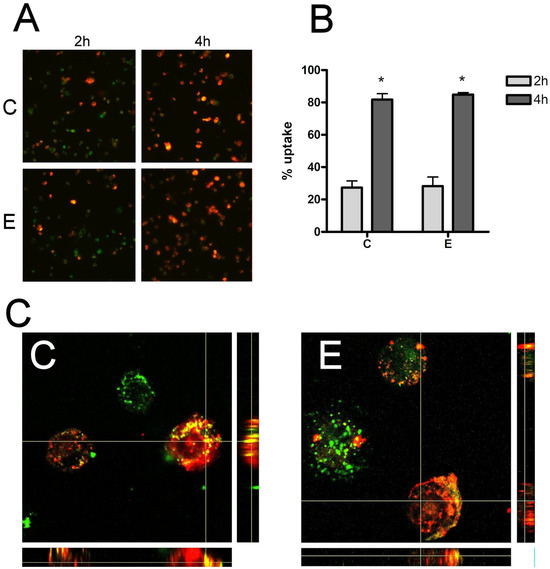 (A) Cell uptake of sEV by THP1 macrophages 2 h and 4 h (10×). (B) No relevant changes were observed in sEVs uptake by THP1 macrophages at 2 h or 4 h. (C) Confocal analysis of sEVs uptake (60×). sEVs were stained with red PKH26 dye and cells were stained with green PKH67 dye. C = Control E = Endometriosis. * = p < 0.05 vs. 2 h.
