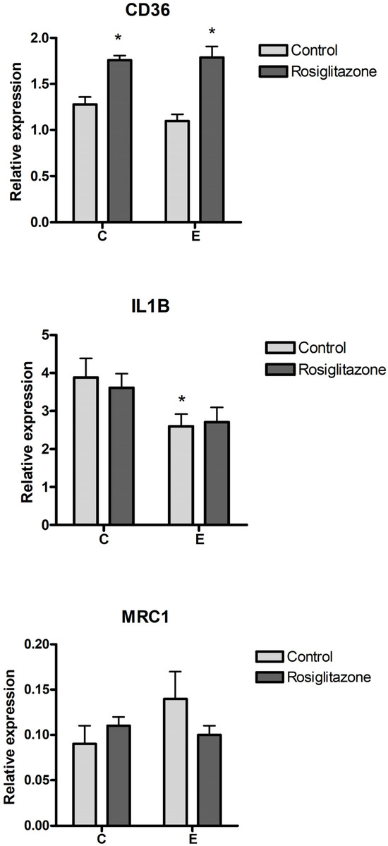 Effect of pharmacological activation of PPARG on CD36 and macrophage phenotype using rosiglitazone treatment. C = Control; E = Endometriosis. * = p < 0.05 vs. C.