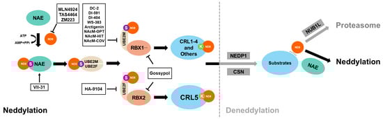 Neddylation is a type of post-translational modification (PTM). This process involves the covalent attachment of the neural precursor cell expressed developmentally downregulated protein 8 (NEDD8) to the substrate protein through a series of enzymatic reactions similar to ubiquitination [1,2,3,4,5,6]. After binding to a conservative lysine target, NEDD8 can affect substrate conformation, stability, localization, and functions [2,7,8,9,10,11].
