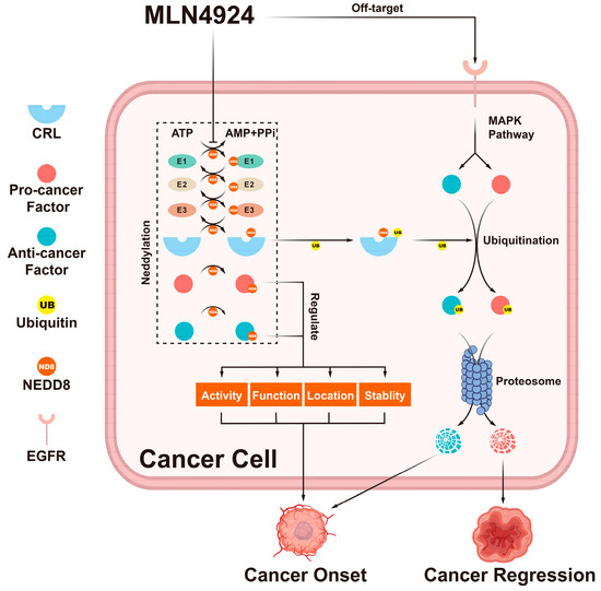 As mentioned above, numerous anti-cancer factors and pro-cancer factors are directly modified by NEDD8 [3], and certain neddylation substrates such as CRL, EGR1, and HIF-1α can simultaneously regulate both types of factors [5,12,28,29]. Therefore, the neddylation pathway can inhibit or promote cancer cell proliferation and invasion. This duality explains why MLN4924, a neddylation inhibitor, can have unintended pro-cancer side effects.