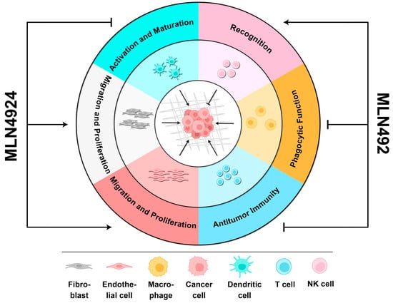 In addition to cancer cells, recent research has verified that the neddylation pathway in non-malignant cells can reprogram the TME and significantly affect cancer progression by regulating their functions [14,19]. For instance, by targeting blockages in the neddylation pathway of CAFs, which are known to promote cancer cell proliferation, drug resistance, invasion, and migration [51], the proliferation and migration of CAFs can be inhibited and the secretion of pro-cancer factors can be reduced [14]. For macrophages, their phagocytosis/clearance of cancer cells was recovered with the neddylation of src homology region 2-containing protein tyrosine phosphatase 2 (SPH2), while the deneddylation of SPH2 abolished it [30]. The neddylation pathway also promotes the proliferation of vascular endothelial cells (VECs) [18,19], suggesting its involvement in tumor angiogenesis. Furthermore, the neddylation pathway, which regulates the maturation and activation of immune cells such as T cells and dendritic cells (DCs), plays a significant role in antitumor immunity [3,14,52].