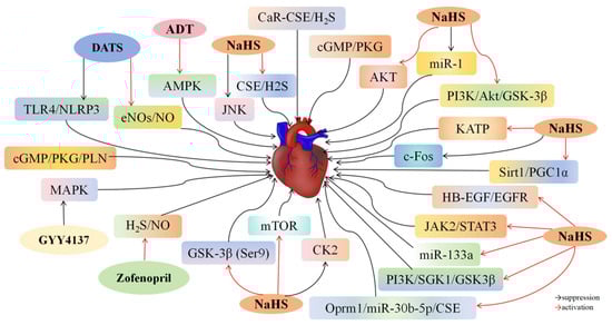 | GYY4137 (12.5, 25, 50 mg/kg) | Oxidative damage and apoptosis in cardiomyocytes ↓ | MAPK pathway ↓ | [56] | |