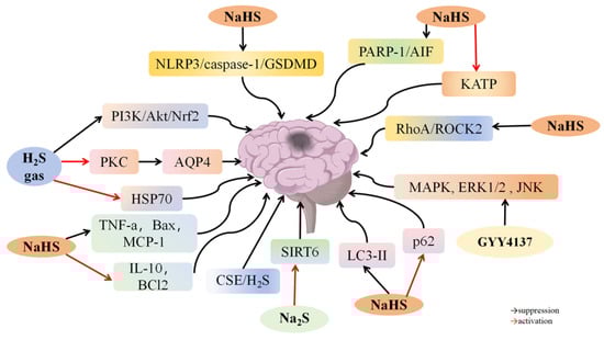 | NaHS (50 μM/kg) | Neuronal pyroptosis and inflammation ↓ | IL-1β, IL-18, NLRP3/caspase-1/GSDMD pathway ↓ | [75] | |