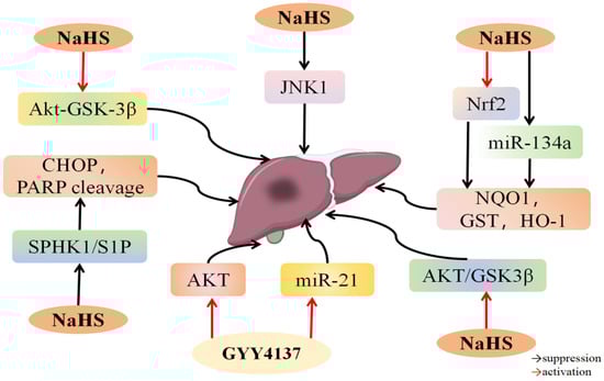 | GYY4137 (133 μM/kg) | Liver damage and cell apoptosis ↓ | AKT pathway and miR-21 expression ↑ | [93] | |