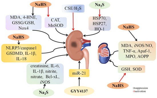 | Na2S | Kidney injury ↓ | IL-6, IL-1β, nitrite, nitrate ↓ | [102] | |