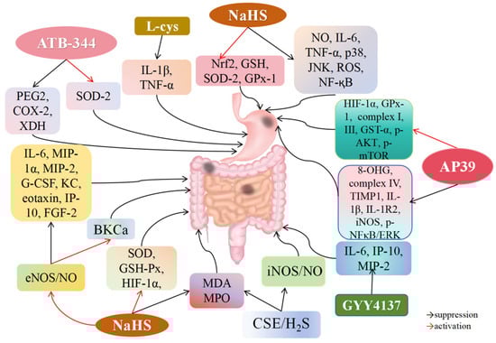 | NaHS, GYY4137 | Gastric mucosal damage ↓ | SOD-2, GPx-1 expression ↑ | [107] | |
