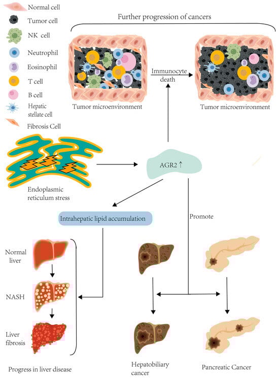 Endoplasmic reticulum stress promotes AGR2 overexpression, which, on the one hand, is involved in the progression and deterioration of liver disease by causing an increase in lipids; on the other hand, AGR2 overexpression induces immune cell death and promotes hepatobiliary and pancreatic Cancer invasion.