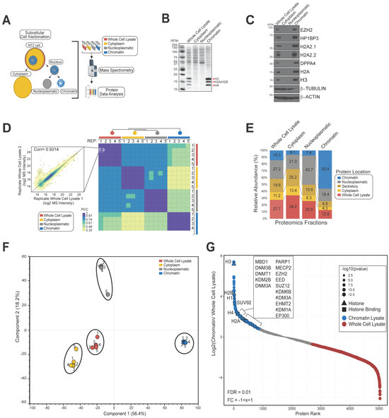 Figure 1. Expression proteomics of biochemically separated subcellular fractions in a cultured cell pluripotency model. (A) NT2 cells were separated into cytoplasmic, nucleoplasmic, and chromatin fractions and analysed by LCMS. (B) The fractions were separated by SDS-PAGE; prominent histone bands localizing to the chromatin fractions are arrowed. (C) Western blotting was used to confirm successful separation using fraction-specific marker proteins. (D) Pairwise correlation analysis confirmed high reproducibility of the LCMS platform for replicate analysis of each fraction (n = 5). (E) Relative proportions of proteins annotated to be located in the listed cellular compartments. (F) Experimental separation of the requisite fractions and replicate analyses were confirmed using principal component analysis. (G) The chromatin fraction is rich in histones and chromatin-modifying proteins (box inset). Ion intensities for >5000 proteins identified in the various cell fractions were ranked by enrichment in the chromatin fraction relative to cell lysate. Original Western blot images can be found in Supplementary Figure S1.