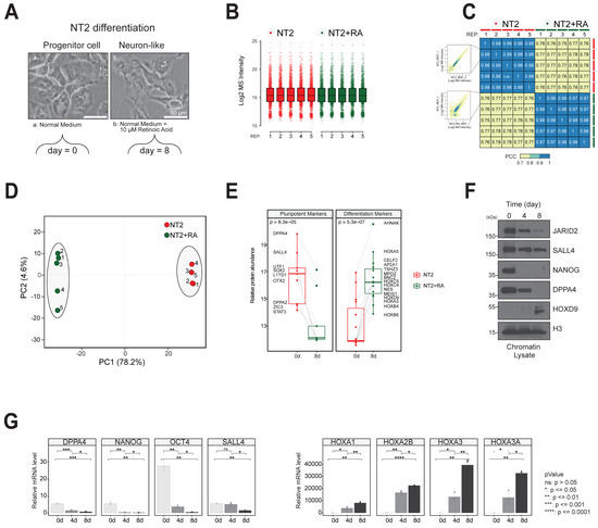 Figure 3. Chromatin proteome changes induced by differentiation. (A) Cultured pluripotent NT2 cells were induced to differentiate by treatment with retinoic acid. (B) Mass spectrometry signal intensities for 3740 proteins detected in the chromatin fraction were distributed evenly in both undifferentiated and differentiated cell states. (C) Correlation analysis of technical replicates (n = 5) for both cell states confirms strong experimental reproducibility. The insets show examples of the distribution of two technical replicates of the pre-differentiation cells (top) and two samples drawn from the pre- and post-differentiation states (bottom). (D) Cell state and technical replicate experiments also project onto closely clustered groups using Principal Component Analysis. (E) Proteins designated ‘Pluripotency Markers’ showed decreased expression upon differentiation, while proteins designated ‘Differentiation Markers’ were increased. (F) Western blotting confirmation of selected protein expression changes. (G) RT-PCR confirmation of selected mRNA expression changes. Original Western blot images can be found in Supplementary Figure S1.