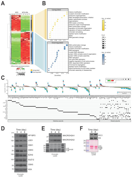 Figure 4. NT2 cell differentiation programme centres on processes involving chromatin modification pathways. (A) Heat map plotting z-scores of 166 up-regulated and 320 down-regulated proteins following treatment with retinoic acid. (B) Differentially expressed proteins mapped to functional pathways governing gene expression regulatory activities. (C) Protein expression changes for components of chromatin-modifying complexes. (D) Western blotting confirmed protein expression changes observed in the proteomics experiment for histone proteins and chromatin-modifying enzymes. (E) Western blotting confirmed protein expression changes observed in the proteomics experiment for macroH2A1 and macroH2A2. (F) Western blotting confirmed protein expression changes observed in the proteomics experiment for histone H3 and H3.3. Original Western blot images can be found in Supplementary Figure S1.