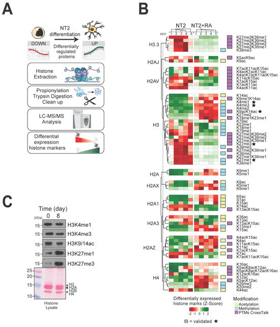 Since we found that many histone modification enzymes and protein complexes were regulated during the differentiation process, we next aimed to quantify any changes to global levels of the modification states of their histone substrates (Figure 5A). We again used mass spectrometry, employing a chemical derivatization procedure to compare the relative abundance of histone acetylation and methylation modifications before and after treatment with retinoic acid [33]. Overall, 140 distinct modification sites were measured across twelve histone proteoforms (Supplementary Table S3). Relative ion signals for each modification were plotted on a heatmap to highlight histone marks showing 67 significant modification site changes during NT2 cell differentiation (Figure 5B).